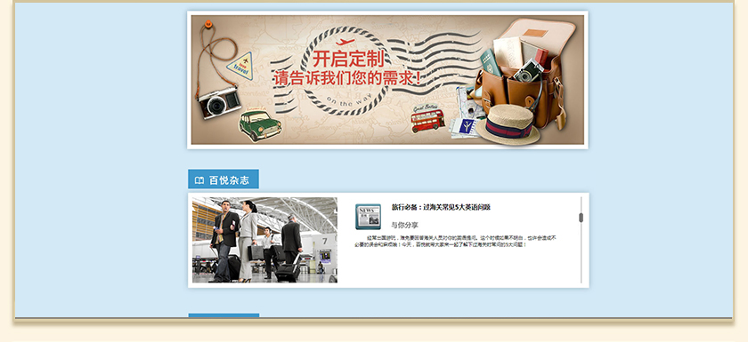 Project Description 百悦逸游于2012年初由二位资深的旅行家创办,是成都传媒集团旗下成都新闻国际旅行社有限公司的高端旅游品牌,总部位于成都高新区天府大道中段美年广场。在百悦逸游成立之前,创始团队亲自到全球三十多个国家实地考察,带着第一手的资讯和执着的信念创立了中国西部第一家真正意义上的私人定制旅行机构。百悦的旅行不是跟团挤大巴,不是十天去十个国家,更不是没完没了的... Official website address 银川http://www.100.travel I want to share